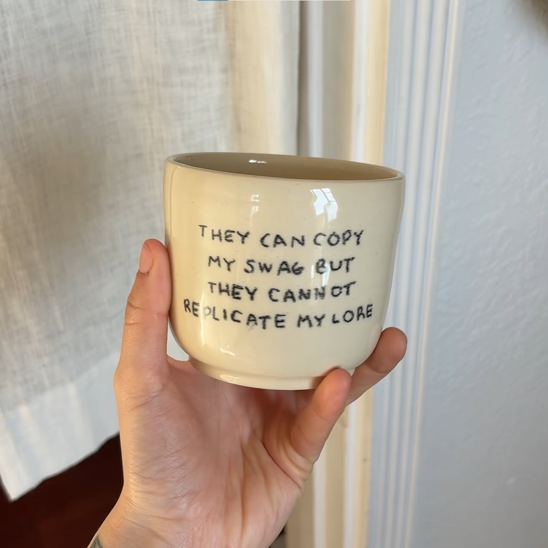 Turn to the side, and the handwritten phrase “THEY CAN COPY MY SWAG BUT THEY CANNOT REPLICATE MY LORE” suddenly pops out, like Snoopy giving the world a cheeky wink: Others can mimic my cool, but they can't steal my one-of-a-kind story.