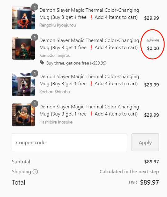 We have buy three get one free, you just need to select any four cups to add to the shopping cart, you can get one free !!