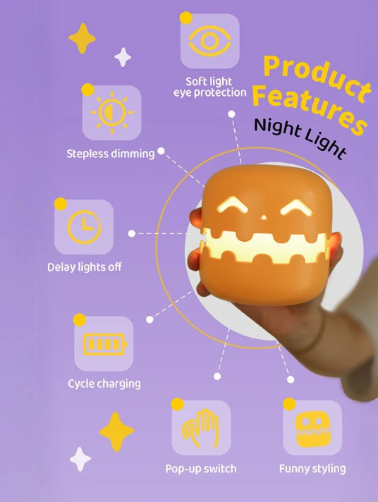 🎆With stepless dimming for customizable brightness and a delay light-off feature, it’s perfect for winding down. Its cycle charging means no spooky interruptions, while the pop-up switch makes turning it on a treat. Ideal for bedside or festive decor, the Pumpkin Night Lamp brings Halloween magic to life, all while protecting your eyes with gentle, soft light.