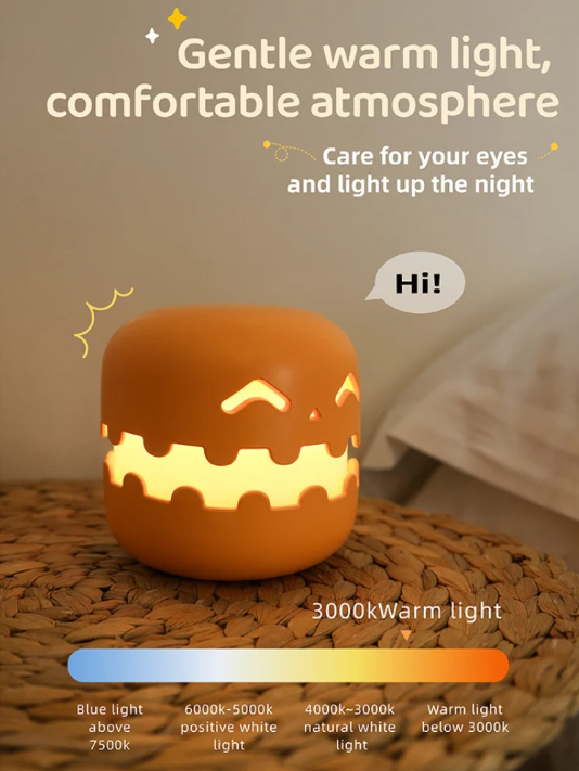 ❤️‍🔥Soothing Glow That Cares for Your Eyes!The Pumpkin Night Lamp provides a soft, gentle 3000K warm light designed to create a soothing atmosphere while caring for your eyes. Whether you're winding down before bed or enjoying a quiet evening, the warm glow ensures a relaxing experience without harsh brightness. Its calming light makes it perfect for nighttime use, reducing eye strain while keeping the room softly lit. Add both comfort and style to your space with this eye-friendly, festive lamp.